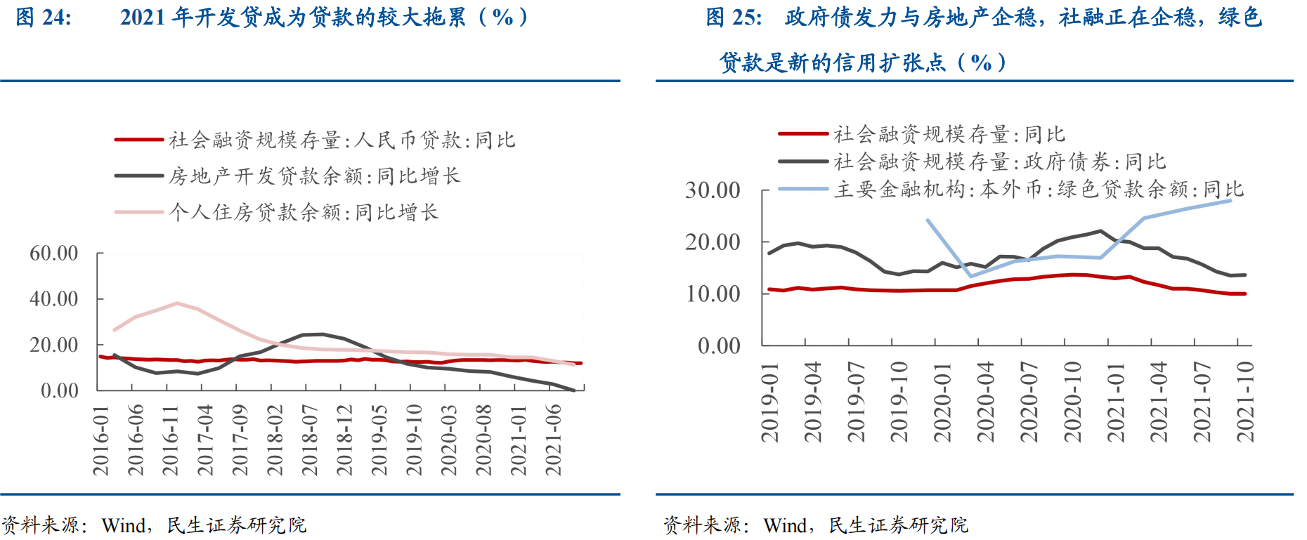 从这一角度看,房地产对信用扩张的拖累将减弱,且当前政策正在引导新的信用扩张渠道。2021年预计房地产到位资金中涉房贷款增速仅0.92%,一定程度上拖累了信用扩张。而2022年根据我们的预测,稳定房地产需求所需的信贷增速为5.2%-9.3%,这一增速从历史上来看较低,容易满足;其次,对信贷增速的拖累也将显著减弱。此外,政策指引下还存在新的信用扩张渠道:(1)能源转型:主要通过绿色贷款、绿色债券、碳减排支持工具等方式,鼓励资金流向有助于能源转型的经济活动中;(2)乡村振兴:利用再贷款利率等工具引导信用直达实体,支持“三农”及小微企业。