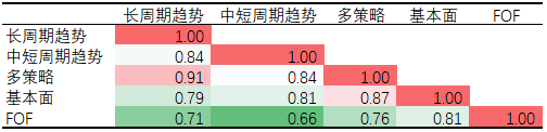 可以看到,四类策略和FOF彼此之间的相关性在今年是比较高的,普遍在0.7以上,一方面这说明各类策略的收益来源大部分仍然是市场给的趋势动量贝塔收益,另一方面,我们的确观察到底层的各类因子,如量价、期限结构、基本面,在今年的相关性较过去有所提升。无论是策略还是底层因子,其相关性的提升,对管理人都是一个挑战,需要在品种分散性和回撤控制上面做出更多努力。