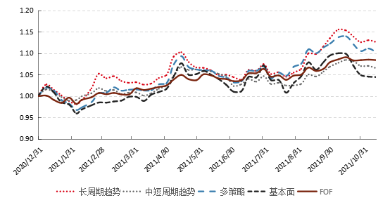 第三季度,表现最好的是长周期趋势,8.13%;其次是多策略7.58%;基本面,6.66%;中短周期趋势2.08%。这段时间黑色板块由于能耗双控环保限产、天气、疫情等因素影响供给端,出现结构性行情。8月,焦煤和焦炭的期货价格各自上涨20%和14%。在8月初,暴雨影响了焦煤从蒙古国的运输。月底,蒙古国德尔塔变种再次限制了焦煤的供给。由于焦煤是焦炭生产的原料,焦炭的价格也跟随上涨。此外有色板块,部分品种因为碳中和导致产量受限,表现强势。整体来看,这段时间市场主要受供需基本面逻辑驱动,并且在9月有较大幅度的上涨趋势,各类策略均有较好收益。