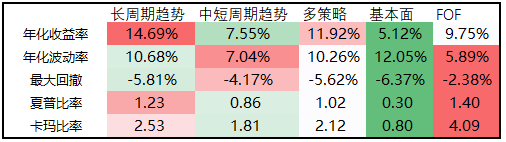 从上图可以看到,对比FOF和单策略的表现,CTA 多元配置相对只配置单一策略有明显的优越性,体现在波动和回撤控制地更好,夏普比率和卡玛比率的表现更好,意味着忍受同样的风险可以获得更好的收益。所以这才是当下投资者想要得到的答案。
