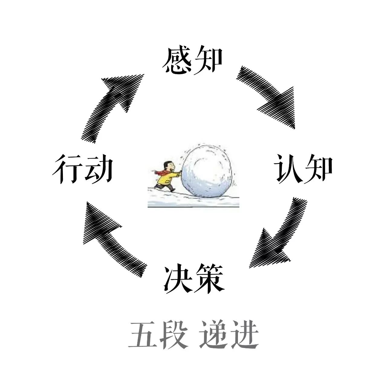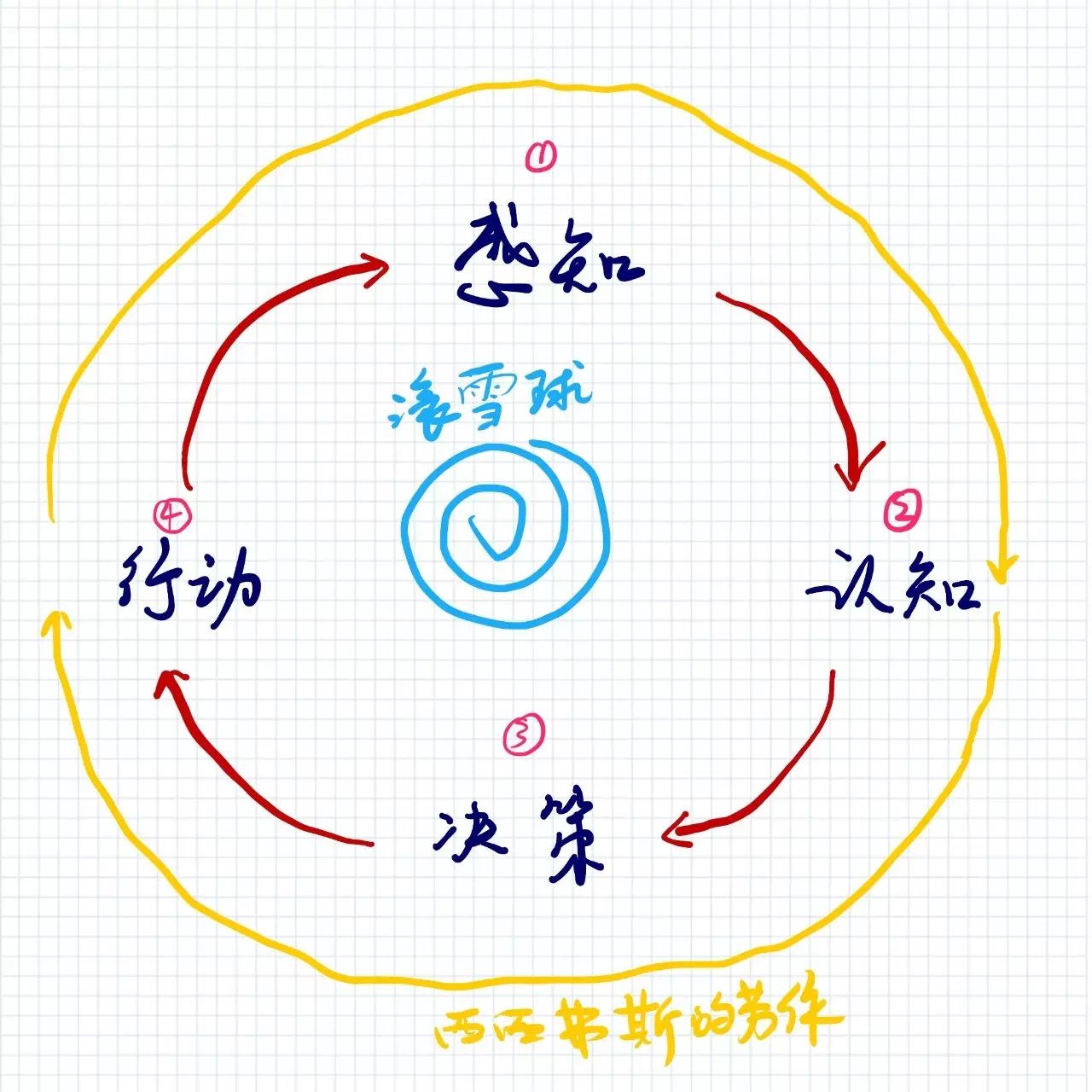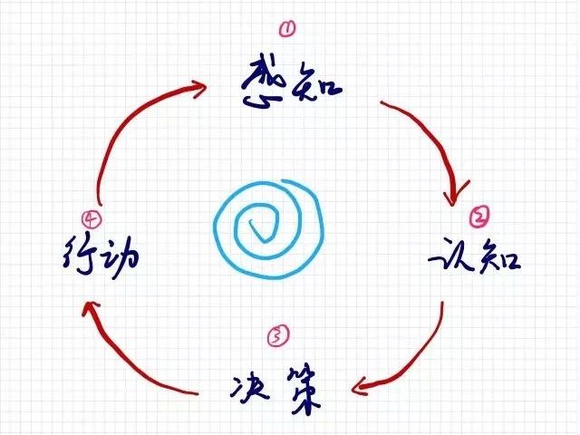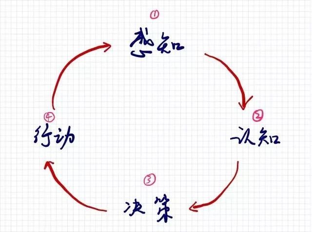 由人行为的原理可知,人的行为的过程主要由人对环境信息的获取 、感知 、处理和输出组成 ,即感知 、认知和决策以及行动的过程。我们思考一个问题,做一件事情,开展一个项目,都需完成如上这个认知闭环。我们的每天、每年、此生,都是由无数个或完整、或残缺的该基本单元链接构成。该闭环由4个节点构成:感知-认知-决策-行动。该“认知闭环”飞转起来,便成为“认知飞轮”。