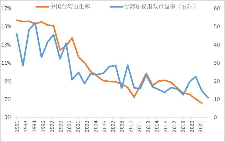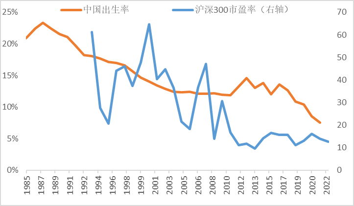 如果把过去30年来的出生率走势和股市平均市盈率走势作为对比,基本上都呈现了股市市盈率随着出生率下降而下降的趋势,其中日本和韩国股市都在1989年左右经历过一轮大泡沫,市盈率阶段性失真。部分历史市盈率数据是用“指数涨幅-名义GDP增速”估算倒推的。