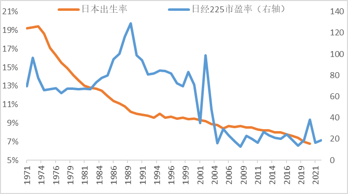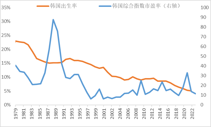 股市是经济的晴雨表,股市反映的是投资者对未来经济的预期。同时,在某种角度看,生育率也代表家庭对未来生活条件的预期。首先看日本,1990年代房地产及金融泡沫破灭之后,日本被称之为失去的30年,1990年代初,日经225指数的平均市盈率曾超过100倍,到2002年已降至35倍。之后日本的出生率水平虽然还在回落,但估值水平相对于其他东亚股市要高。