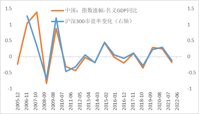 “指数涨幅-名义GDP增速”与实际市盈率差异(中国)