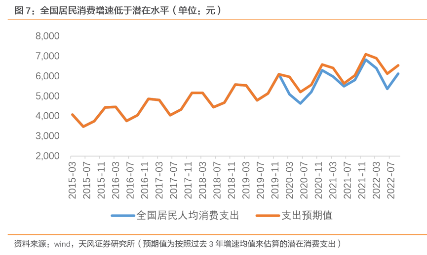 按往年均值估算,2022年前三季度居民可支配收入累计低于潜在趋势约1872元/1804元,消费支出低于潜在趋势约1648元/1756元,对应人均-224/-48元的额外储蓄,即今年前三季度消费减少或并未给居民部门带来超额储蓄。