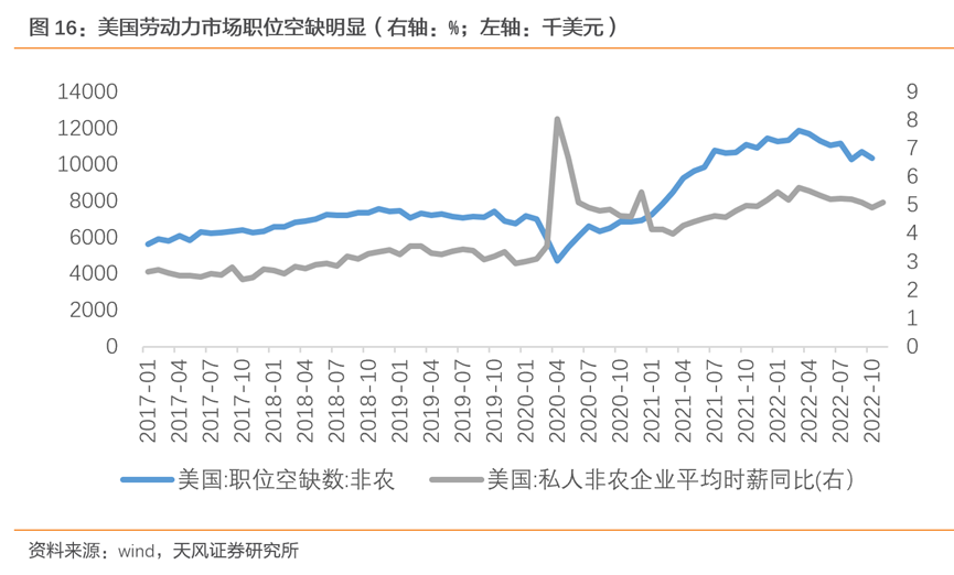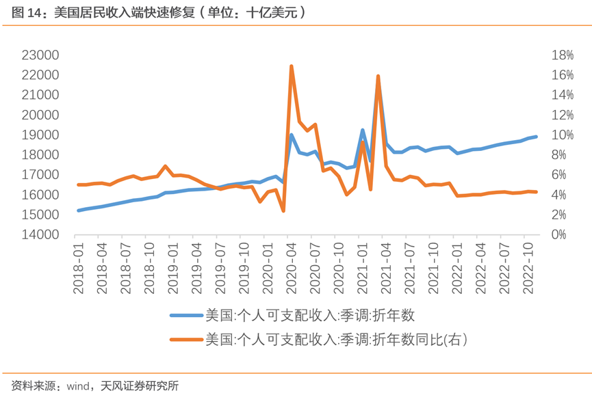 二是薪资增速快速修复。疫情后美国劳动力参与率从2019年12月63.3%快速下滑至2020年4月的60.2%,一直到2022年11月(62.1%)也未修复至疫情前水平。同时美国职位空缺数从2019年末的674万人最高上行至2022年3月的1186万人。劳动力供不应求推动美国居民工资快速上行,2020-2022年12月时薪同比月均值为4.89%,高于2017-2019年同比月均值1.9个百分点。这在财政补贴结束后,支撑了美国居民收入端修复。