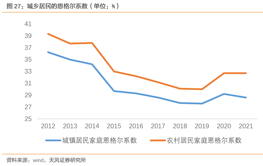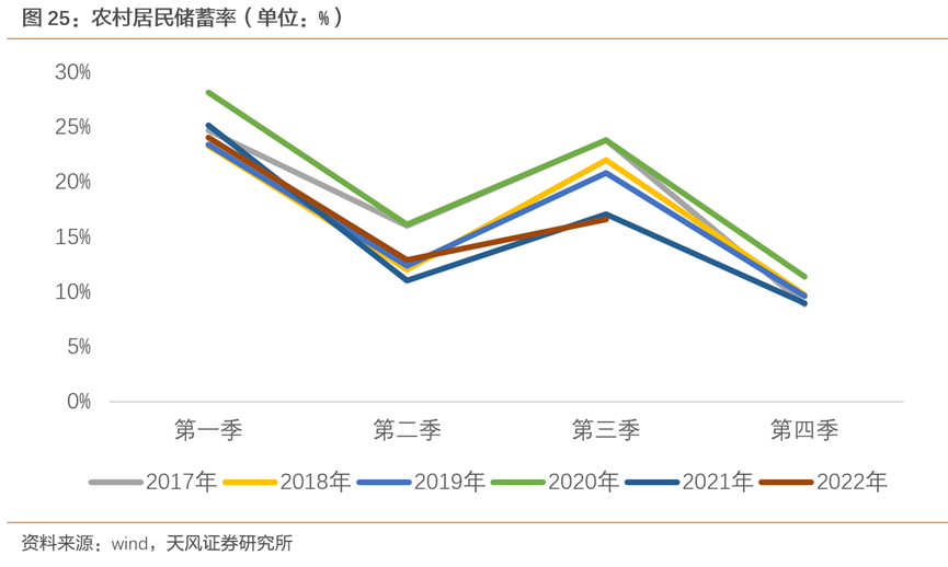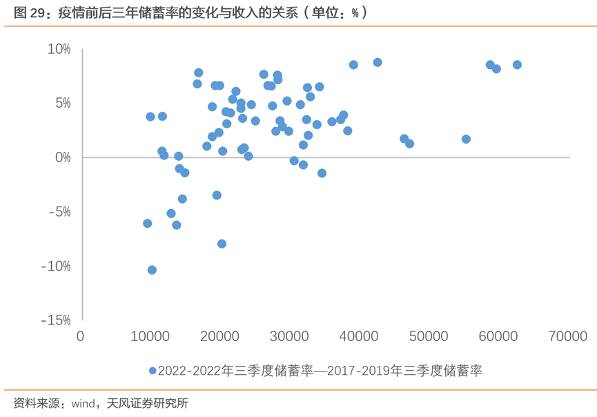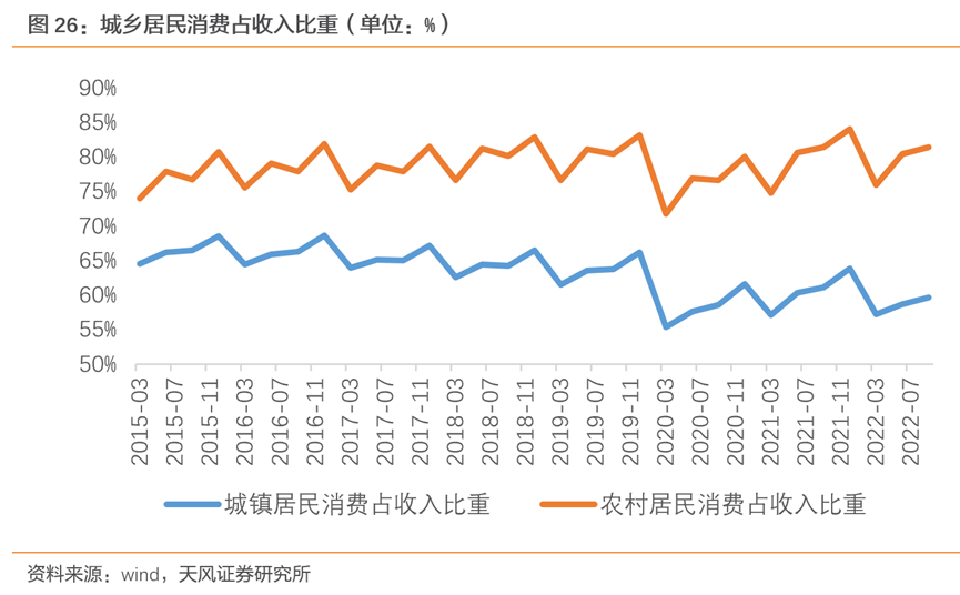 数据显示,2022年城镇居民疫情期间储蓄率明显高于疫情前,但是农村居民储蓄率略低于疫情前水平。这与农村居民支出刚性有关,2022年前三季度,城镇居民人均消费支出占可支配收入的比重为59.7%,农村为81.5%。2021年城镇居民的恩格尔系数为28.6%,农村居民为32.7%。在收入下滑时,农村居民消费刚性,只能减少储蓄。而城镇居民因可选类消费占比高,收入下滑时可以降低可选消费支出,储蓄率不降反升。