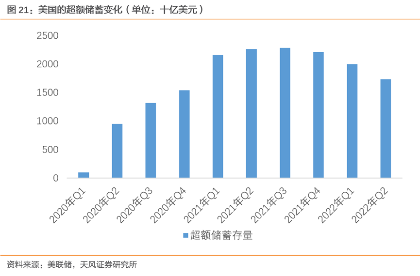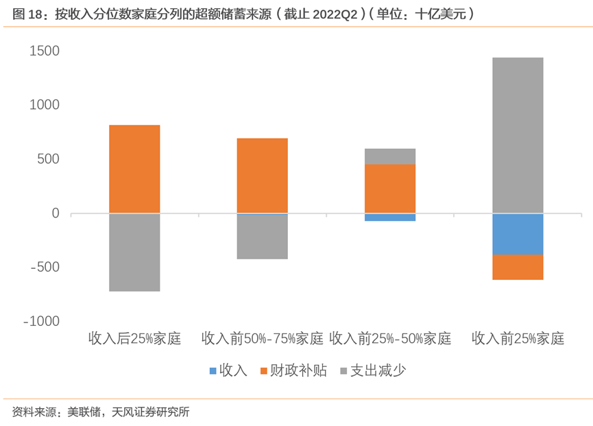 一部分超额储蓄来源于政府财政转移支付带来的收入增加,这部分超额储蓄主要集中于美国低收入群体。截止2022年2季度,收入后50%分位家庭的超额储蓄主要来自于接近1.5万亿美元的财政转移支付。