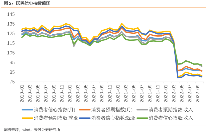 连续三年疫情也压制了居民的收入预期。2022年以来,受国内疫情影响,消费者信心指数、预期指数(均包括收入和就业两类)分别从1月的121.5和124.5下滑至4月的86.7和86.8。且4月之后,消费者信心指数和预期指数迟迟未重回疫情前水平,居民收入预期持续偏弱。