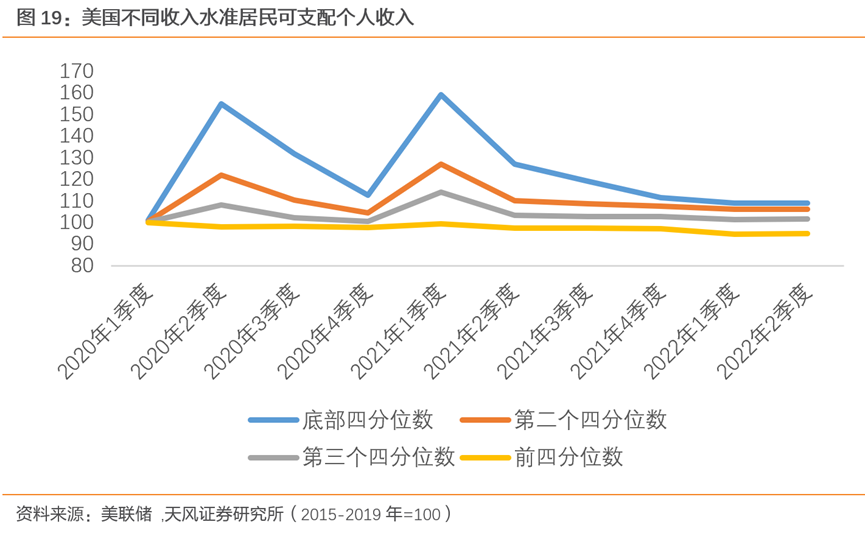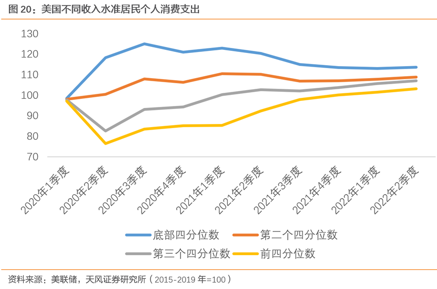 但美国高收入群体(收入前25%分位家庭)不是财政补贴的主要目标人群,收入承压,消费修复缓慢,高收入群体消费支出到2021年四季度才修复至疫情前水平(指数达到100),且后续修复高度较低,到2022年2季度也仅有103。