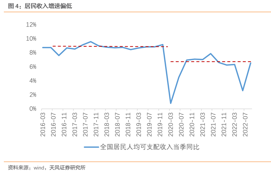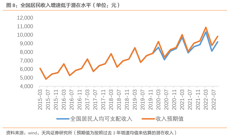现实情况是2020年以来,居民部门收入增速一直低于疫情前水平。2020、2021和2022年居民可支配收入名义同比增速分别为4.7%、6.9%(两年同比)和5.3%,显著低于2019年疫情前水平8.9%的增速。