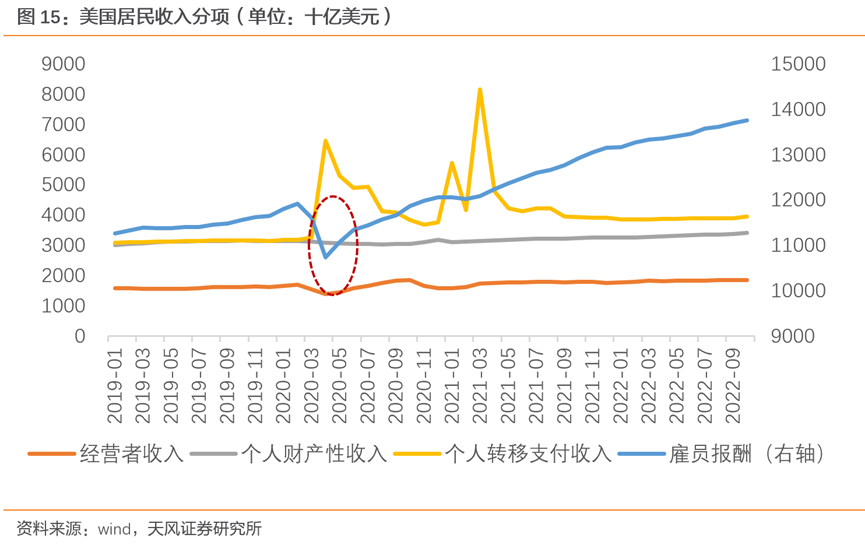 对比2020年之后美国居民的收入情况和超额储蓄情况,可以看到,疫情以来中美两国居民的超额储蓄来源存在明显差异。