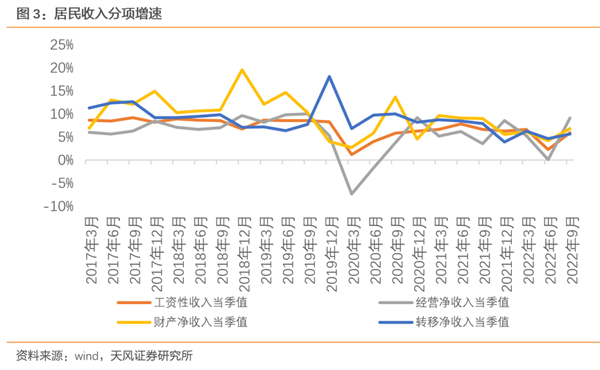 第一,消费的领先指标从疫情变为收入,收入修复是明年消费修复的前置条件,收入预期和收入来源都会影响消费修复。“劳动所得”(工资性收入、经营性收入)的修复利好必需消费,“无偿所得”(转移性收入、财产性收入)能够更有效的刺激居民增加可选消费。