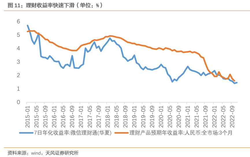 除房地产销售市场外,理财资金回流存款则补上了超额储蓄的另一块拼图。2022年资本市场波动加大,理财收益回落推动居民部门减持理财产品,资金回流存款,今年偏弱的资本市场收益也降低了居民部门购买基金等的意愿,基金规模增速在2022年明显回落。