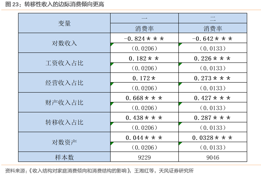 国内研究经验也证实了不同收入来源对消费的影响存在差异——转移性收入和财产性收入的边际消费倾向显著高于工资性收入和经营性收入,且工资性收入和经营性收入更多用于居住等生活必需支出,财产性收入和转移性收入则用于提高众多子类消费。