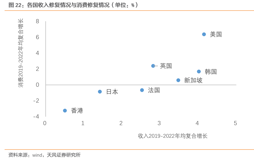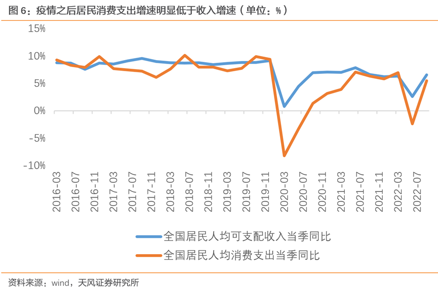 从这个角度看,转移性收入能够有效地刺激居民消费修复,而由收入预期下行带来的超额储蓄对消费的支持力度明显偏低,因为这部分存款本身就是依靠减少消费而来的。因此,消费的修复往往以收入的修复为前提,除非直接发钱,否则只有等到居民收入预期好转时,超额储蓄才有可能转化为超额消费。