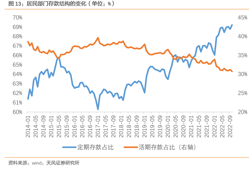 这部分超额储蓄对应了今年居民存款的定期化趋势。从存款结构上看,2022年1-10月新增人民币活期存款1.2万亿(过去三年均值为1万亿),与过去均值水平接近。新增定期存款11.5万亿(过去三年均值为7万亿),超额增幅接近4.5万亿。这也推动居民定期存款占比持续上行,2022年10月金融机构人民币存款中,住户部门定期存款占比达到了69%,创近年来新高。