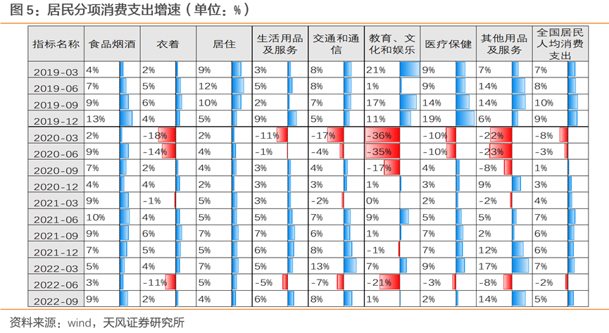 一方面,受收入预期转弱的影响,居民消费支出增速明显下滑,且同比降幅大于收入。在受疫情影响明显的2020年上半年和2022年上半年,居民人均消费支出累计同比仅-5.9%和2.5%,大幅低于疫情前8%左右的同比增速。分项结构中,食品烟酒、居住等必需品消费维持韧性,而教育、文化和娱乐、衣着等与线下消费密切相关的消费则偏弱。