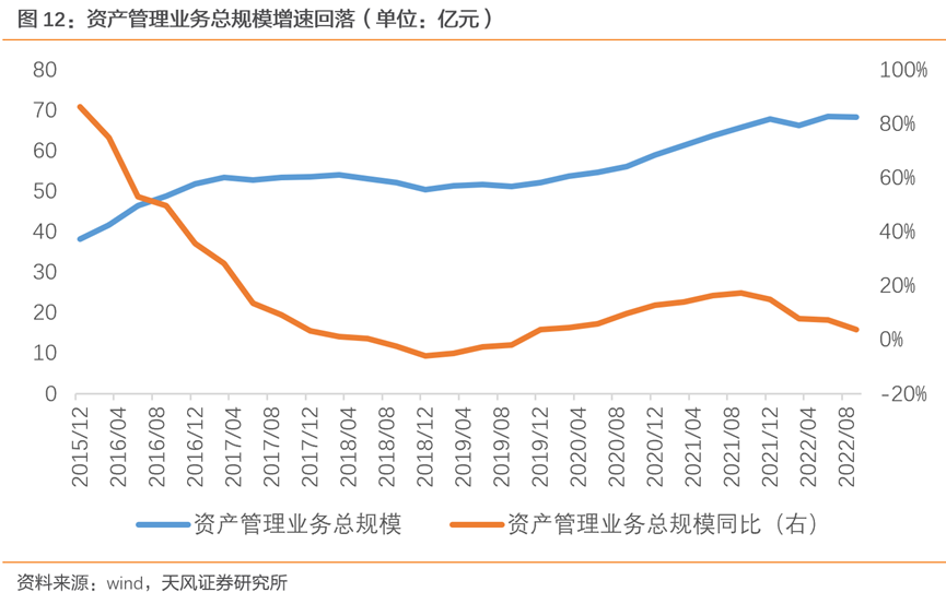 2019-2021年前三季度国内资产管理业务新增总规模分别0.8、3.9和6.9万亿,但是2022年前三季度资管业务仅新增0.5万亿,大幅低于过去三年均值水平。