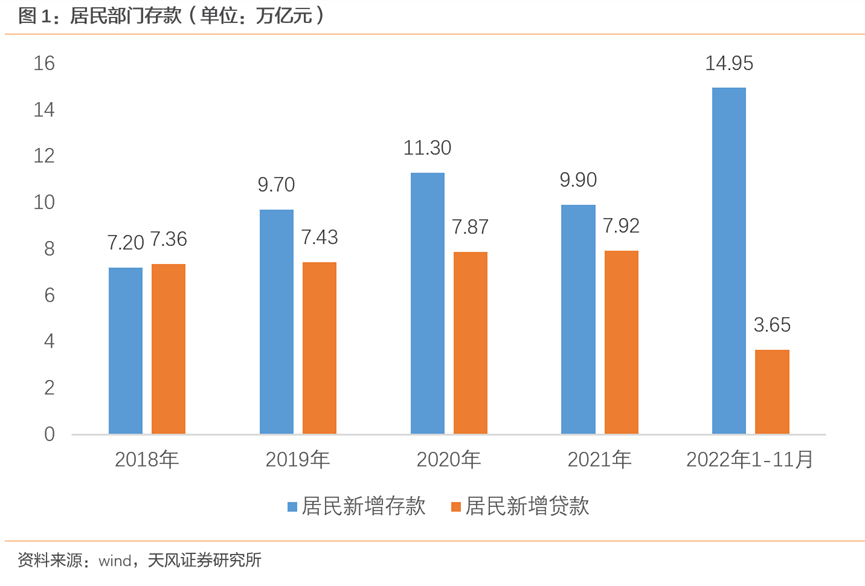 数据显示,2022年1-11月,居民部门新增存款14.9万亿,算上过去5年12月居民新增存款均值1.4万亿,2022年全年居民部门新增存款或超过16万亿,大幅高于往年水平(2019、2020、2021年分别为9.7万亿、11.3万亿和9.9万亿)。从居民部门的存款数据来看,2022年居民部门的超额储蓄规模或在6万亿左右。