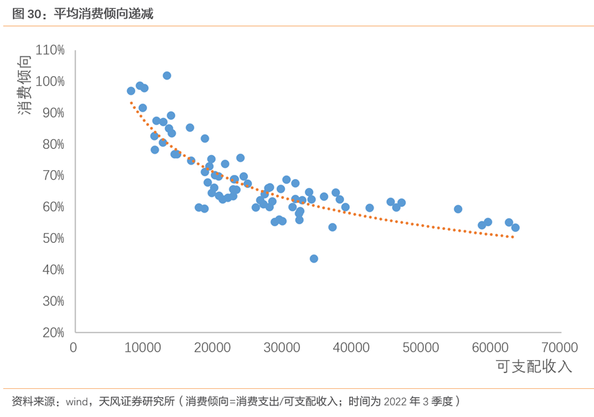 第三,目前国内超额储蓄或主要集中于高收入群体,而低收入群体的收入端明显承压且缺乏财政转移收入来源,2022年储蓄率不升反降。明年高收入群体的收入预期改善,储蓄率回落,高端可选消费如奢侈品消费有望率先改善,但是高收入群体的边际消费倾向低,对整体消费反弹的支持力度有限。明年低收入群体的实际收入修复,储蓄率可能先回升,初期部分收入可能用于回补近年来低收入群体的储蓄下降,这意味着低收入群体的初期消费力度偏弱,但如果收入能有持续改善,未来必需消费或将得到持续支撑。