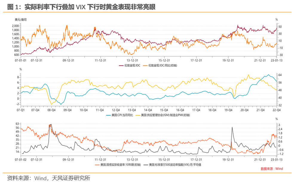 从次贷危机爆发以来的历史来看,当实际利率下行同时VIX上行时,黄金表现都非常亮眼,例如2007年Q1至2008年Q1,2011年Q2-Q3和2020年Q1,囊括了金价同比涨幅四个高点中的三个(剩下一个高点2009年则是由欧债危机主导的),这四轮黄金行情开始的节点,通胀都已经进入下行的后半段或处在相对底部的位置。而黄金相对表现最差的2013年,正是VIX处在低位且实际利率快速上升的一年。(图1)