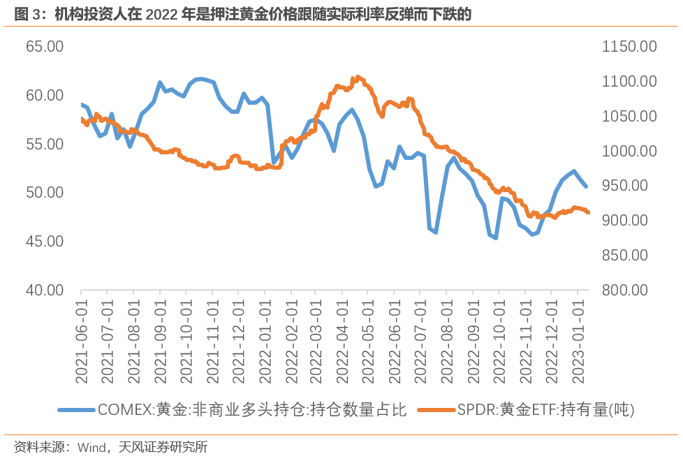但是,如果本轮金价上涨的主要驱动因素是宽松预期交易,那么作为金融属性这枚硬币的两面,金价和实际利率不应该发生如此程度的背离。实际上,机构投资人在2022年是押注黄金价格跟随实际利率反弹而下跌的,全球最大的黄金现货ETF和COMEX黄金期货非商业持仓多头占比在2022年都呈现出了下跌的走势(图3),因此金价相对坚挺是由其他的多头力量在支撑的。