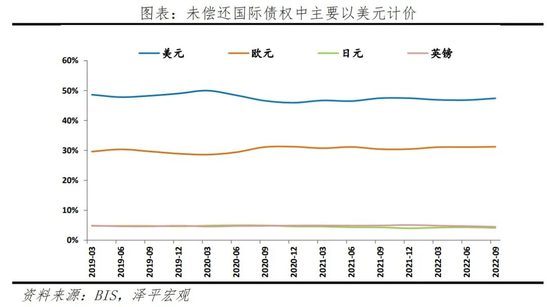 根据BIS国际银行间数据(Locational banking statistics),截至2022年三季度,在按面额货币计价的未偿国际债权(包括信贷和债券)中,美元排名第一,占47.4%,较2019年四季度下滑1.61个百分点;欧元排名第二,占31.2%;日元和英镑分别占比4.5%、4.1%,排名第三,第四。