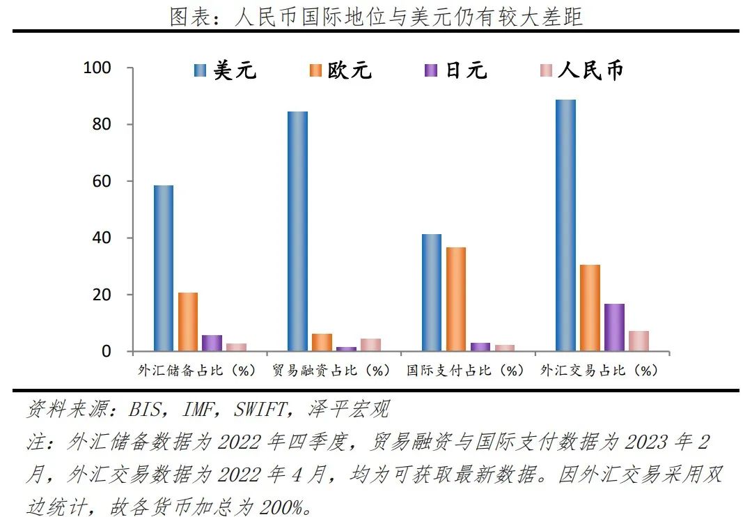 现状:人民币在国际货币体系中的地位与中国在世界经济中的地位不匹配。截至2022年底,人民币全球支付份额仅2.15%,国际储备份额占比2.69%,与中国GDP占世界比重18%不匹配。根据央行发布的《2022年人民币国际化报告》,2022年一季度,人民币的国际化综合指数仅有2.86,远远落后于美元的58.13。