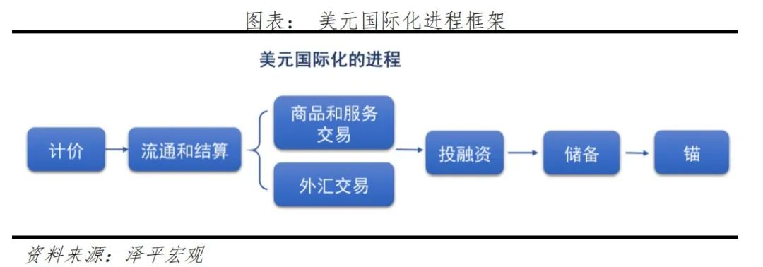美元以计价功能为基础,衍生出贸易结算功能,逐步扩展到投融资功能,成为全球储备和货币之锚。