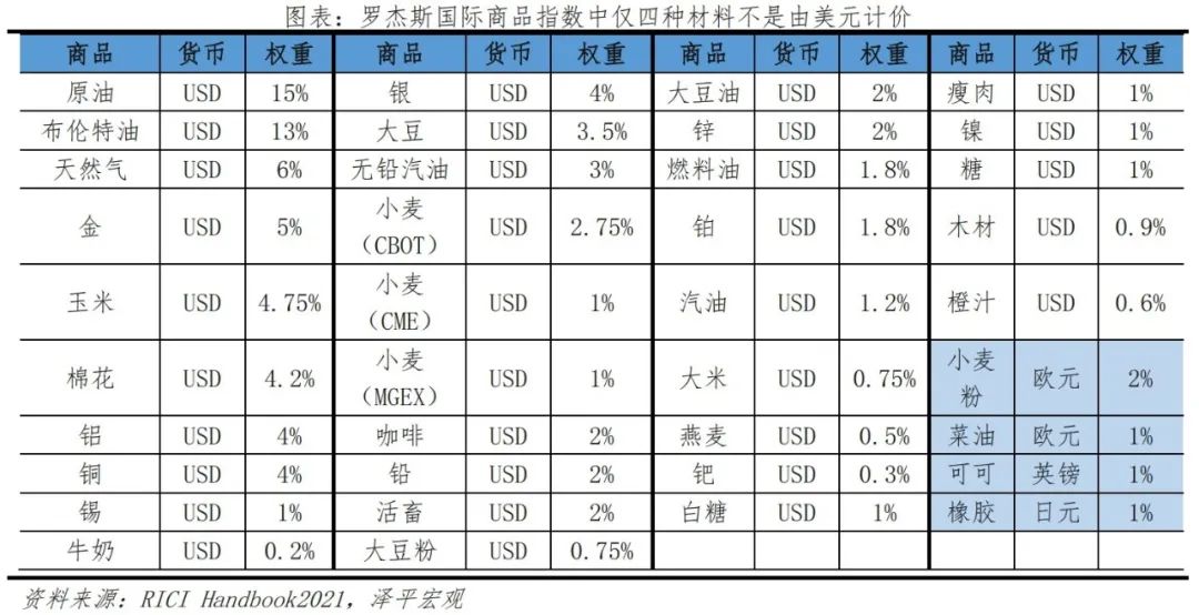 美元与国际大宗商品计价挂钩,任何从事该种商品交易的国家和公司都需要储备美元,增加美元需求。联合国贸易和发展会议发布的81种原材料价格序列,只有5种不是以美元计价;最新罗杰斯国际商品指数(RICI)覆盖共38种商品期货合约,其中仅有可可、橡胶、大麦、菜籽油等四种原材料不是以美元计价,权重占比仅为5%。