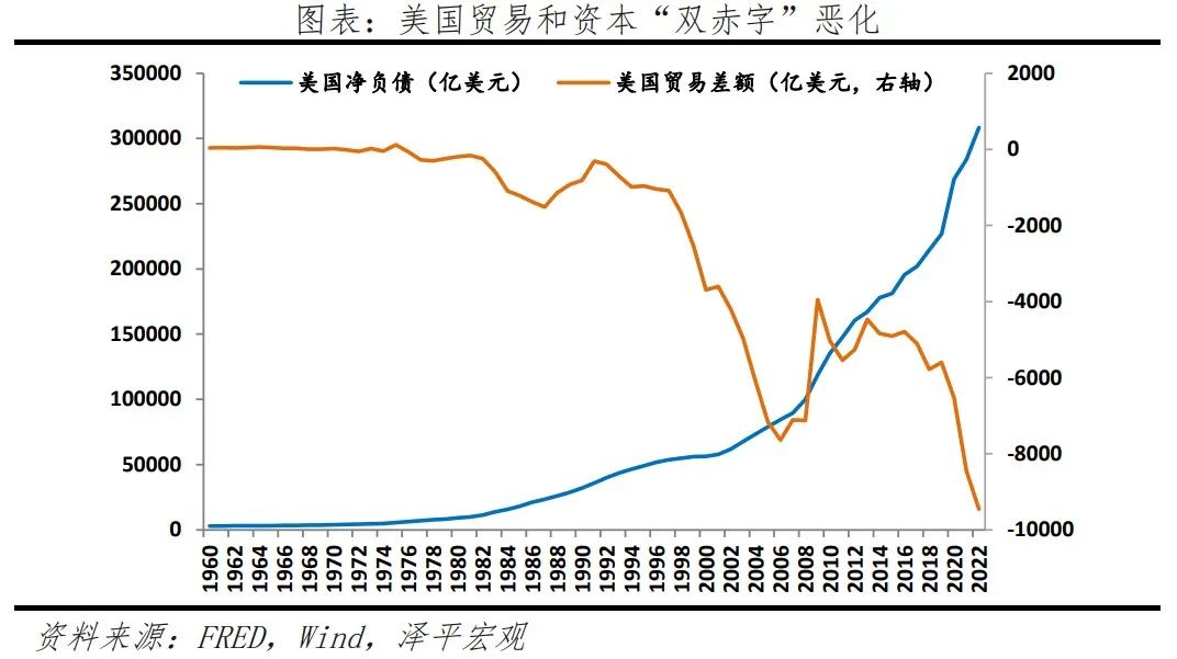 一是居民低储蓄、高消费盛行,贸易赤字成常态。1980年以来,宽松的货币环境和金融创新下,美国个人消费支出占GDP比重从60%快速升至70%。疫情爆发后,居民储蓄占可支配收入比例一度超过30%,但随后快速下降至今年2月的4.6%。根据国民经济恒等式,Y=C+I+G+NX,Y-C=S=I+G+NX,低储蓄和高消费模式下,净出口NX必然持续为负,贸易赤字占GDP比重从1981年0.5%扩大至2022年的3.7%。