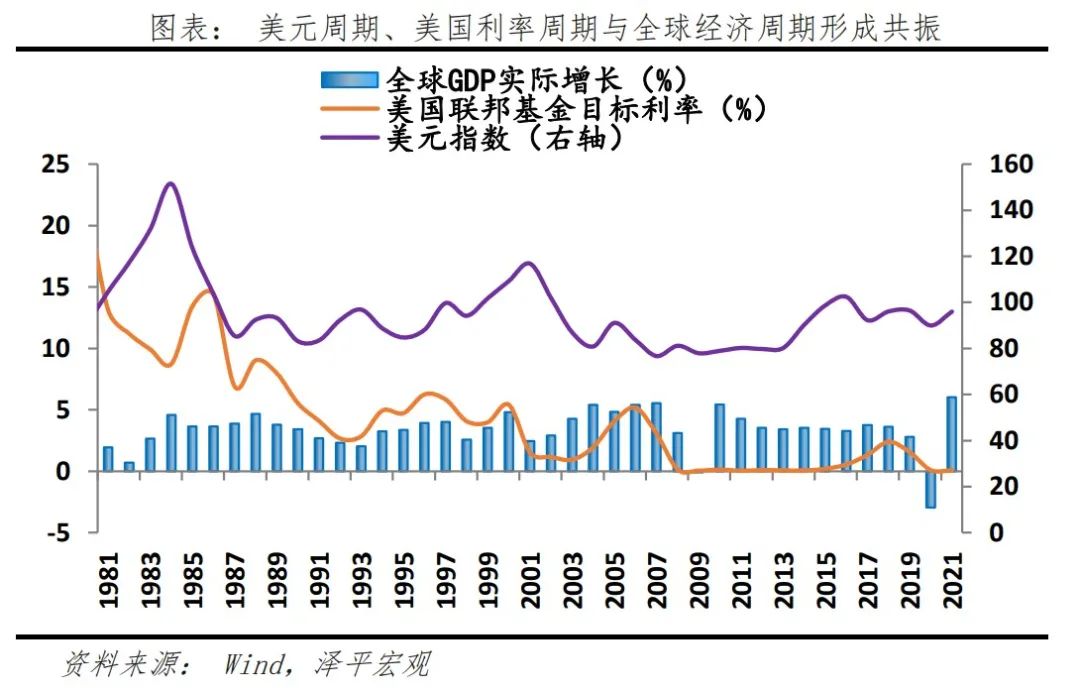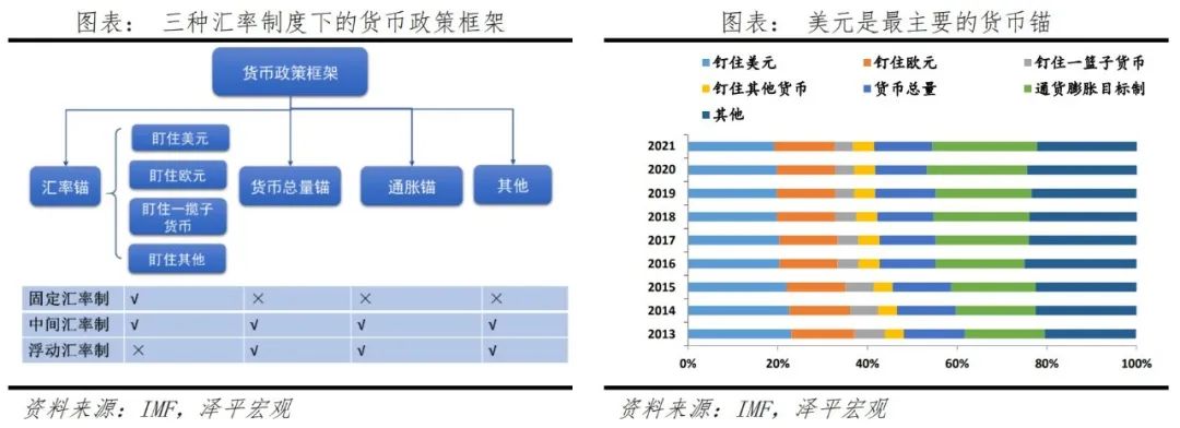 美元是全球流动性之锚。当前普遍实施的汇率制度分为硬钉住(固定汇率制)、软钉住(中间汇率制)和浮动汇率制三大类。其中,选择固定汇率制和中间汇率制的经济体,货币政策紧密跟随锚货币调整,2021年,共有37个IMF成员直接将美元作为货币锚,占比19.2%,距2013年的23%下滑3.8%。另有32个实施自由浮动汇率制度,占比16.6%,但间接受到美元影响。
