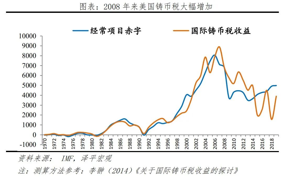 一是美元霸权征收铸币税,输出通胀使债务贬值。凭借外围国家对美元的储备需求,美国向全世界征收铸币税,低成本获取他国的产品和服务。美国支付美元获取他国经济资源,若他国将美元储备下来,美国获得国际铸币税收益,其代价是美国政府需要为他国持有美元储备而支付利息。据测算,美国在1970-1980年每年平均国际铸币税为85.25亿美元,2001-2010年高达6345.93亿美元。