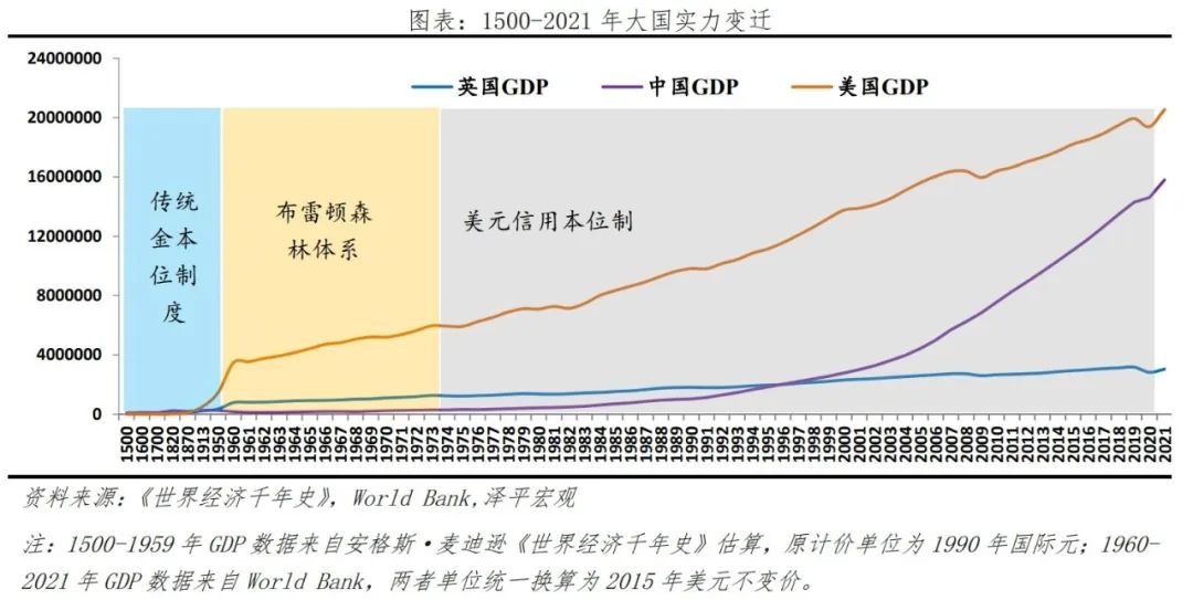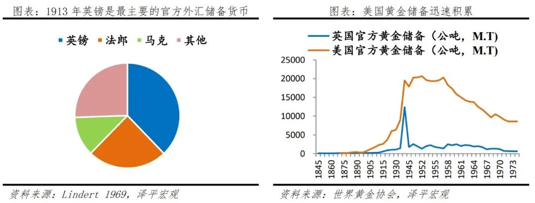 19世纪初,英国率先完成工业革命,为满足战争筹资和殖民扩张需要,1816年英国确立金本位制,通过贸易、殖民等方式将英镑主导的金本位制推向世界,1860-1914年约60%国际贸易以英镑结算,1913年英镑在各国官方外汇储备中占38%。这一时期,尽管美国在1894年GDP赶超英国,但美元并未成为世界货币,1913年美元占外汇储备份额不足5%。直到两次世界大战后,英国实力和国际地位下降,逐渐失去对国际货币体系的掌控,1931年英国宣布放弃金本位,结束了延续一百年的英镑霸权。