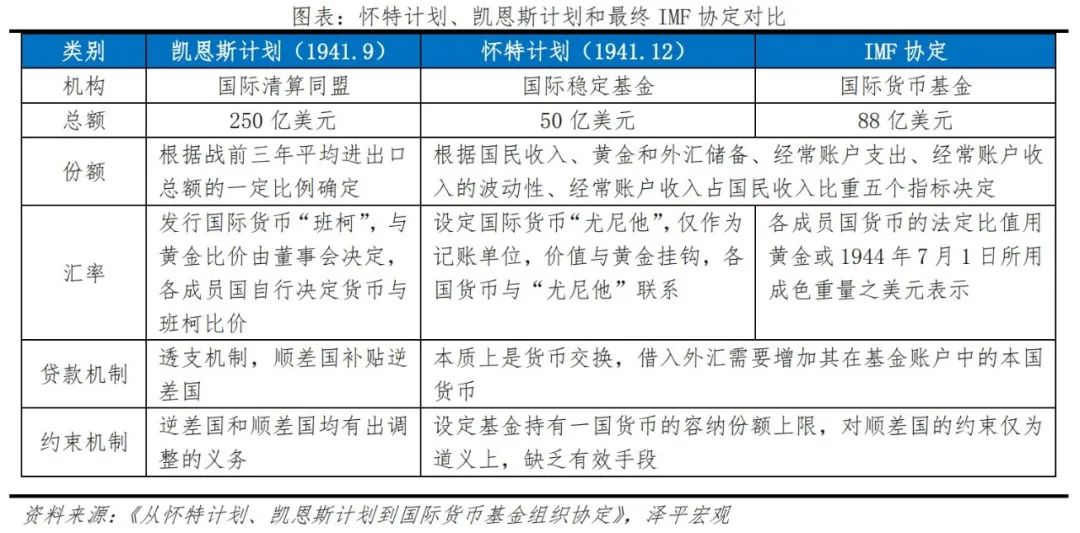布雷顿森林体系正式确立美元的国际货币地位。1944年,英美等同盟国共同商讨重建世界货币体系,代表英国利益的“凯恩斯计划”主张设立全球央行并根据国际收支情况发行世界货币;而代表美国利益的“怀特计划”坚决主张挂钩黄金。最终布雷顿森林体系采纳了怀特方案,35美元可兑换1盎司黄金,各国货币与美元挂钩。