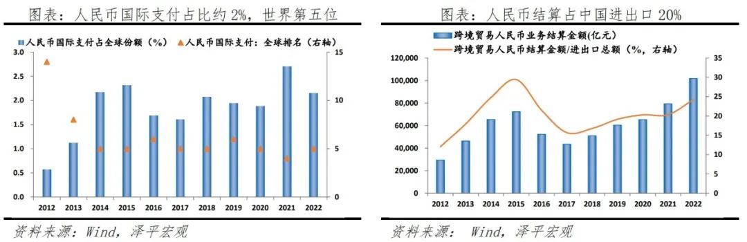 贸易层面,2022年跨境人民币收付总额达到42万亿元,比2017年增长3.4倍,在本外币跨境收付总额中占约50%。从全球来看,2011年12月-2023年3月人民币全球支付份额从0.29%升至2.19%,目前是全球第5大支付货币。
