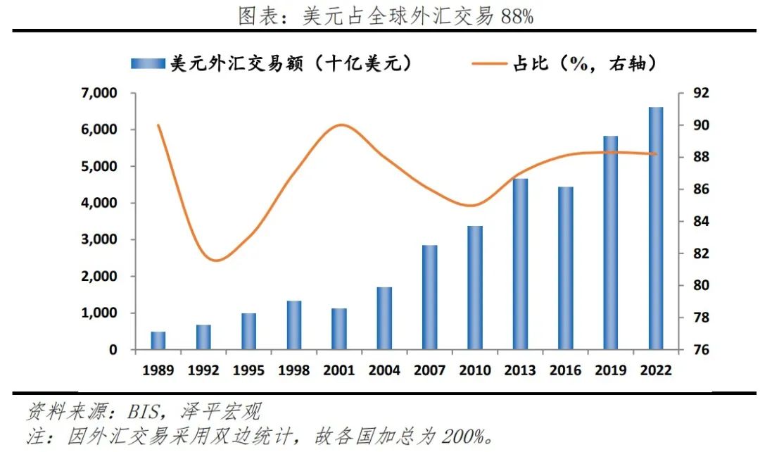 在外汇交易中,美元占全球外汇交易88%。根据BIS最新的2022年度抽样调查结果(2022 Triennial Central Bank Survey),在全球外汇交易中,美元交易达到6.6万亿,占比88%,排名第一;欧元排名第二,占31%;日元排名第三,占17%;英镑排名第四,占13%;人民币占比7%。