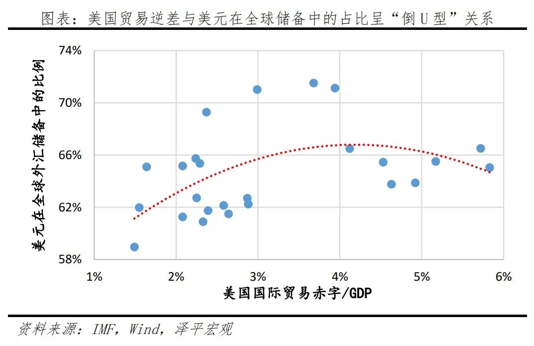 一是理论上看,美元霸权面临“特里芬难题”,双赤字难以持续。特里芬难题是指美元作为国际储备货币无法在为世界提供流动性的同时确保币值稳定。20世纪70年代后美国开始出现“双赤字”,90年代后作为中心国的美国经济不断空心化。拟合1994-2019年美元在全球外汇储备中的比例与美元经常项目赤字的数据,两者呈现“倒U型”关系,贸易赤字占GDP比重超过4%,外围国家对美元信心下降,其他货币部分取代美元成为外汇储备。