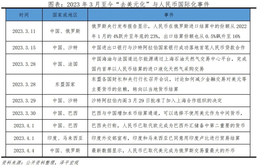 2023年3月以来,美国银行业暴雷,经济前景迷茫,美元信用遭遇严重侵蚀。在“去美元化”浪潮下,人民币国际化取得多项成果:3月15日,中国与沙特之间的首笔人民币贷款达成,交易双方为中国进出口银行与沙特央行;3月29日,首单以人民币结算的进口液化天然气采购交易落地,由中海油采购法国道达尔能源;3月30日,巴西政府宣布,中巴两国增加开通本币结算渠道,可以选择不使用美元作为中间货币。最新数据显示,人民币在俄罗斯已成为交易量最大的货币,在巴西已超过欧元成为第二大储备货币。