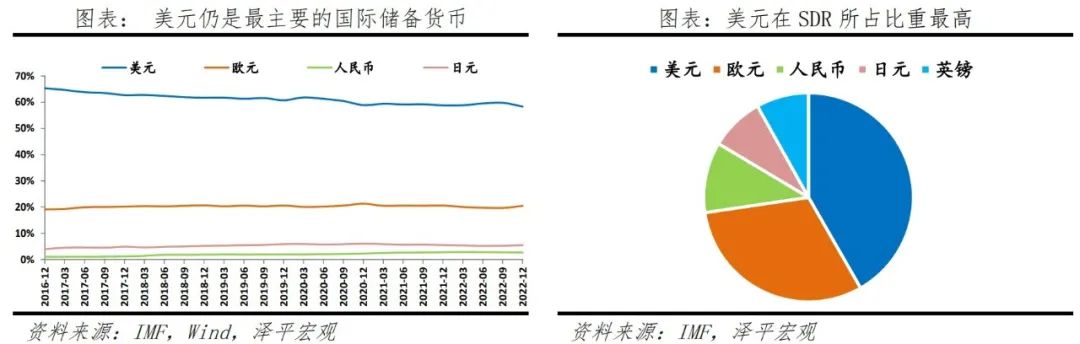 根据IMF的统计,截至2022年四季度,全球已分配外汇储备中,美元排名第一,占58.36%,但占比呈现递减趋势,自2020年四季度起跌破60%。美元在IMF特别提款权中的构成权重达41.73%,其次是欧元,权重为30.93%;2016年10月1日人民币正式被纳入SDR货币篮子,权重为10.92%。