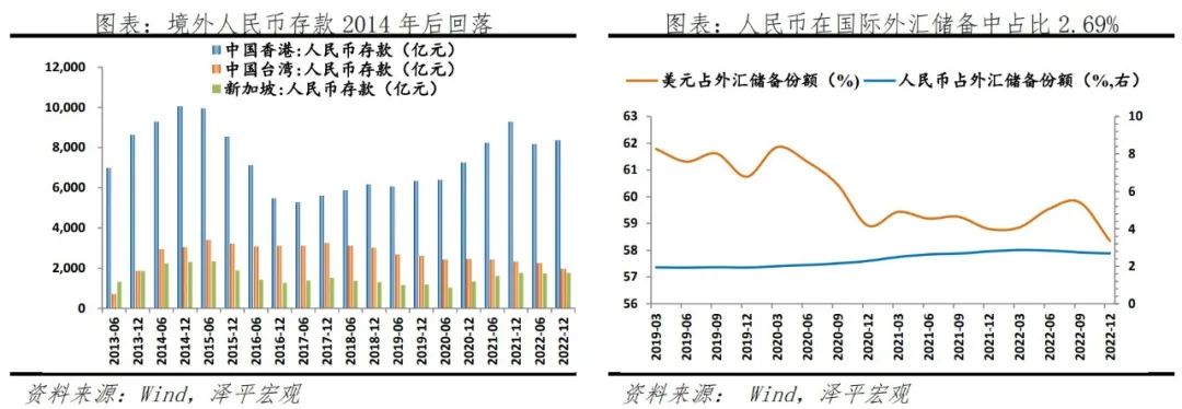 储备层面,人民币2016年加入SDR以来,人民币在全球外汇储备占比从0.29%增至2022年四季度的2.69%。目前已有60多个国家和地区将人民币纳入外汇储备,包括日本、英国、韩国、俄罗斯等。但在份额方面,与美元约60%的占比仍有巨大差距。