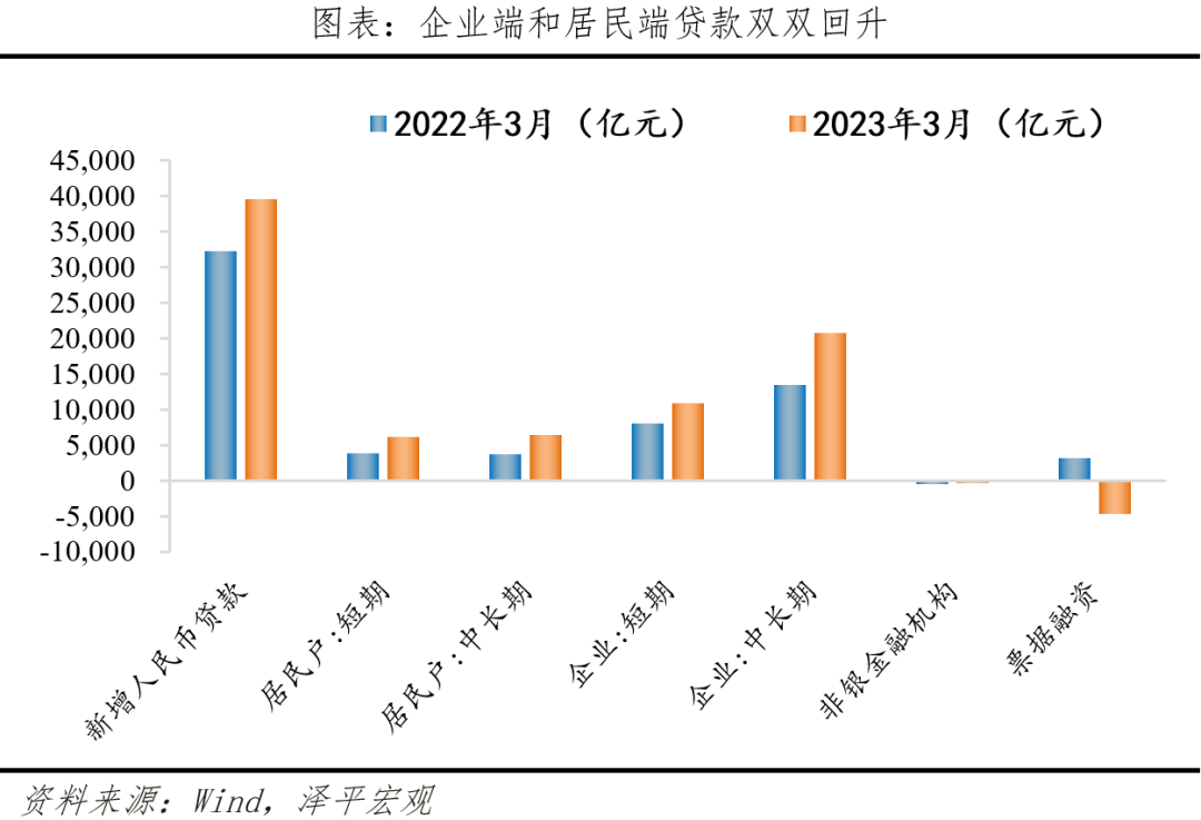 2)信贷持续恢复,企业端需求旺盛,居民端延续复苏。3月金融机构口径信贷余额同比增速为11.8%,较前值高0.2个百分点。结构上,企业端和居民端均多增,票据融资多减。