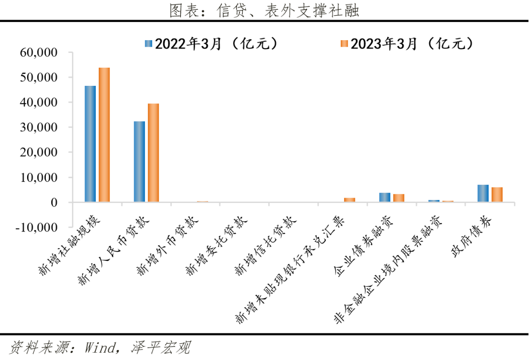 3)政府债券融资少增。3月政府债券净融资6022亿元,同比少增1052亿元。一季度以来共发行新增专项债1.3万亿元,发行进度为34.8%,快于2019-2021年同期。但受去年同期政府发债的高基数效应,3月政府债净融资少增。2023年财政政策加力提效,专项债提前批额度和两会拟安排专项债额度均较去年增加,预计未来政府债仍将对社融形成支撑。