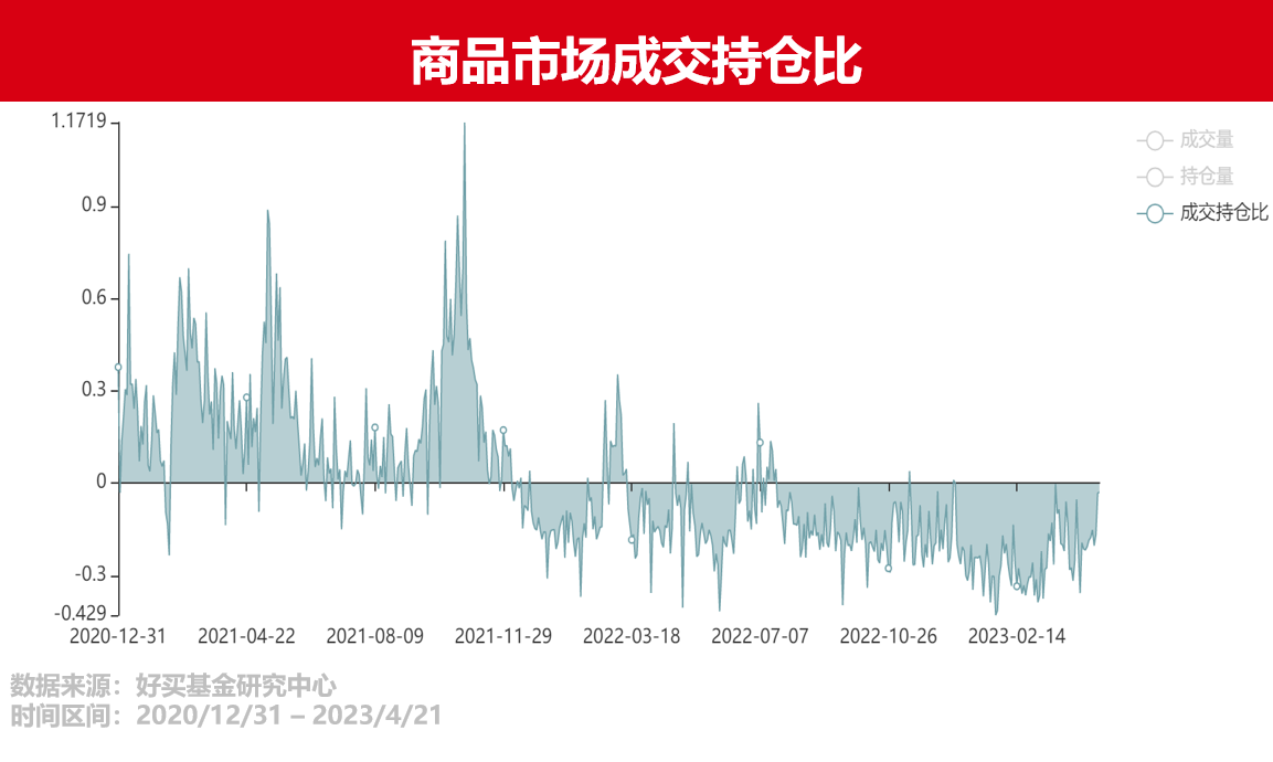 下图为商品市场成交量与持仓量的比值,数值越小,意味着进行商品交易的资金越少,处在观望的情绪越浓厚。在低交易兴趣的环境下,量化CTA也很难捕捉到交易机会。但可以发现,目前成交量已经有了小幅回暖,资金交投显露出了逐渐活跃的苗头。