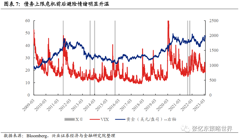 今年跟2011年、2013年相似,美国国会参、众议院分别由民主党和共和党控制。2011年8月与2013年10月是距离违约最近的两次,也是对市场影响较为明显的两次。2011年债务上限危机临近X日才最终解决,叠加了欧债危机及美国长期资信评级遭下调等多重重要宏观事件,市场波动剧烈,而2013年是在X日前一天债务上限才得以解决,即便如此,由于并未拖到最后一刻,且此前已经经历过2011年的冲击,因此与2011年相比,2013年各类资产受影响较小。