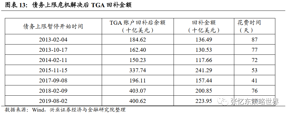 2.2.1、债务上限提高或暂停之前,财政部停止发债、消耗TGA账户相当于向市场投放流动性