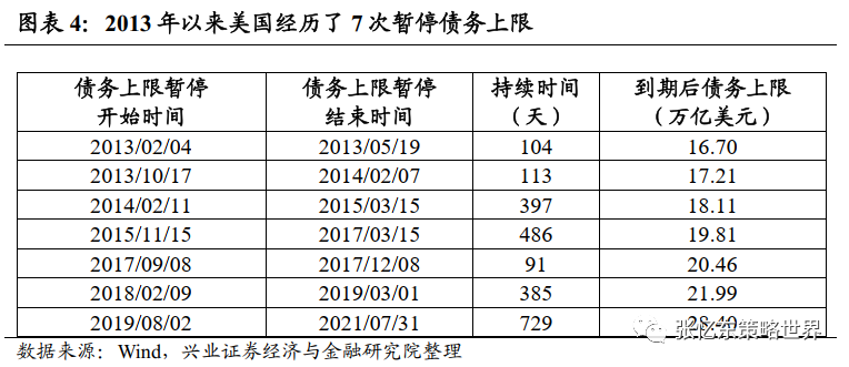 提高债务上限:仅对发行债券总额做出限制,无时间限制。如2021年12月债务上限由28.9万亿美元提高至31.4万亿美元。