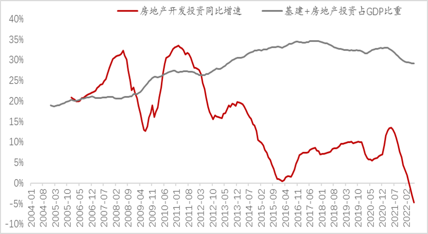 图表:我国基建+房地产投资占GDP的比重在2017年出现拐点