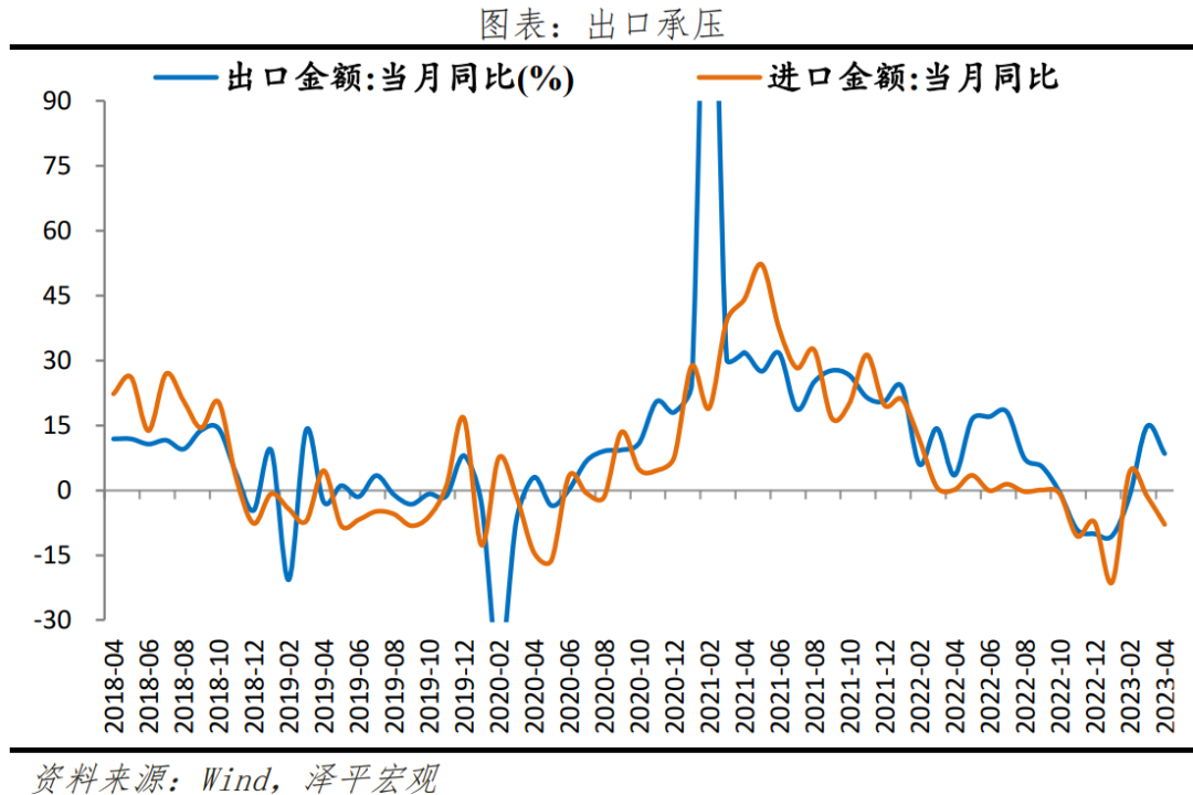 5)出口放缓,需警惕美国反复通胀风险和欧美金融业危机。4月中国出口(美元计价)同比8.5%,前值14.8%;两年复合增速为6.0%,较3月下降8.5个百分点。分产品看,劳动密集型产品出口在集中释放产能后出现回落,高新技术产品和机电产品略有回升。分地区看,对东盟出口大幅下滑,对欧美经济体出口小幅修复。4月进口同比-7.9%,较3月下降6.5个百分点。